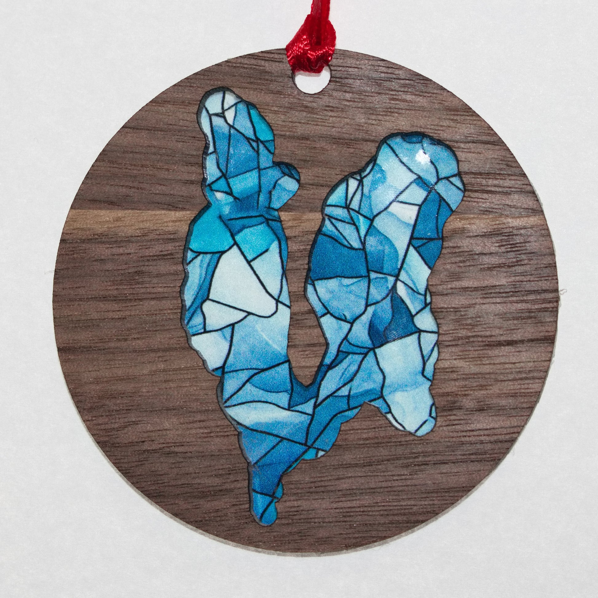 This gorgeous 3-inch Christmas ornament features a unique mosaic design showcasing the beautiful lakes of Michigan. Crafted from acrylic and wood, it also doubles as a charming suncatcher. Add a touch of holiday cheer to your décor with this one-of-a-kind piece.